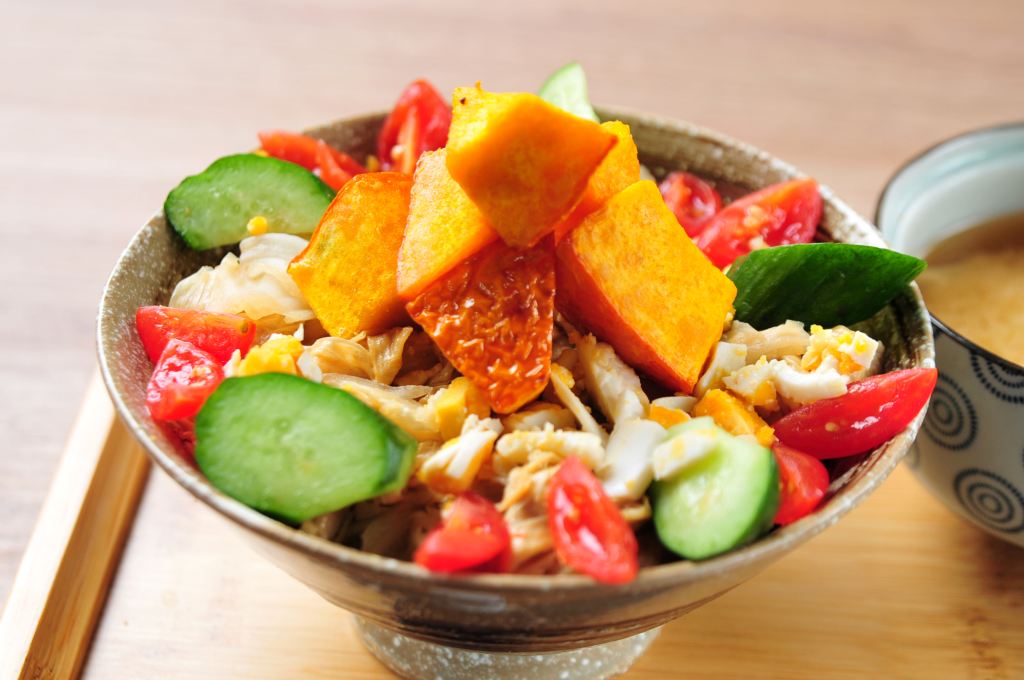 獨特的酥炸鮮甜南瓜搭配台灣鹹蛋及生豆皮、高麗菜、金瓜、鹹蛋、小番茄、小黃瓜,口感豐富。